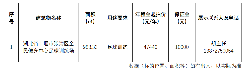 湖北鄖興拍賣有限公司于2025年8月28日上午9時(shí)00分在中國(guó)拍賣行業(yè)協(xié)會(huì)網(wǎng)絡(luò)拍賣平臺(tái)(網(wǎng)址:https://paimai.caa123.org.cn)公開拍賣位于湖北省十堰市張灣區(qū)全民健身中心足球訓(xùn)練場(chǎng)3年期租賃權(quán):